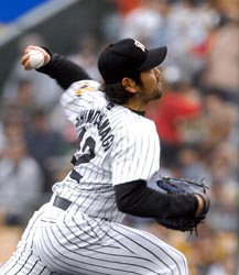 | 雨の降りしきる甲子園で6回2失点。移籍初勝利を挙げた下柳 |