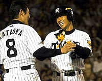 | 八回2ランを放ち片岡に祝福される矢野、この日4打点と荒稼ぎ |