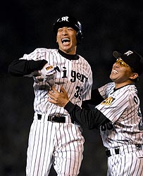 | 九回裏無死満塁、矢野右中間にサヨナラ打を放った矢野(右は岡田コーチ) |