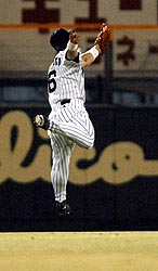 2点を追う九回裏、先頭の桧山が四球を選ぶと、片岡が右前打でつないだ。続くアリアスへの逆転弾への期待は、三浦からマウンドを引き継いだデニーの死球でいったん静まった。しかし直後、無死満塁から直球をたたき返した矢野の当たりは、右中間を切り裂いた。