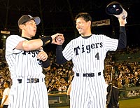 | 男じゃ。これぞ猛虎の男じゃ―。猛爆G倒劇に花を添えた。金本知憲外野手(35)だ。もがき苦しんで17打席連続ノーヒット。迎えた甲子園での巨人戦、そのバットが大爆発する。猛打賞&11号弾でビックイニングを演出し、Vマジックも「47」に。甲子園夏祭り…男・金本の復活祭…熱いゼ! |