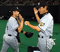 それがハマる。七回一死から今岡が中前打、赤星が送って二死二塁と好機を広げ、打席は金本。カウント2―3からホルトの速球を中前へたたき返す決勝適時打。見事につながった。「何とかしよると思ったけどね」という星野監督に、金本も「何とかバットに当てようと思った」と執念の一打を振り返った。