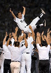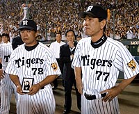 ヤクルトの敗戦を待っての胴上げ。2時間前、赤星のサヨナラ打で広島戦の勝利を決めた本拠地・甲子園で、18年ぶりのリーグ制覇は決した