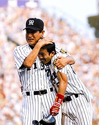 | 優勝を決めるサヨナラ打を放った赤星を星野監督はグッと抱きしめた |
