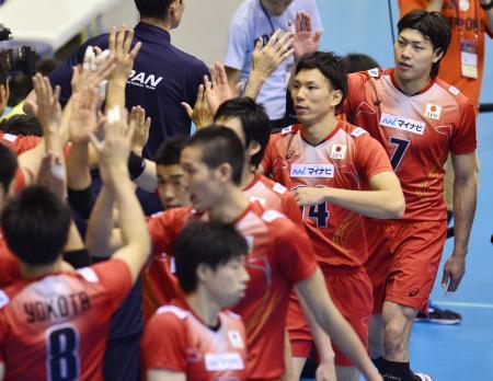 オーストラリアをストレートで下し喜ぶ木村(左端)ら日本=小牧市スポーツ公園総合体育館