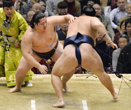 遠藤がはたき込みで鶴竜に敗れる=ボディメーカーコロシアム