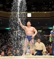 琴恵光(右)に攻められるが土俵際で粘る照強