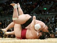 照ノ富士(上)は浴びせ倒しで遠藤を下す