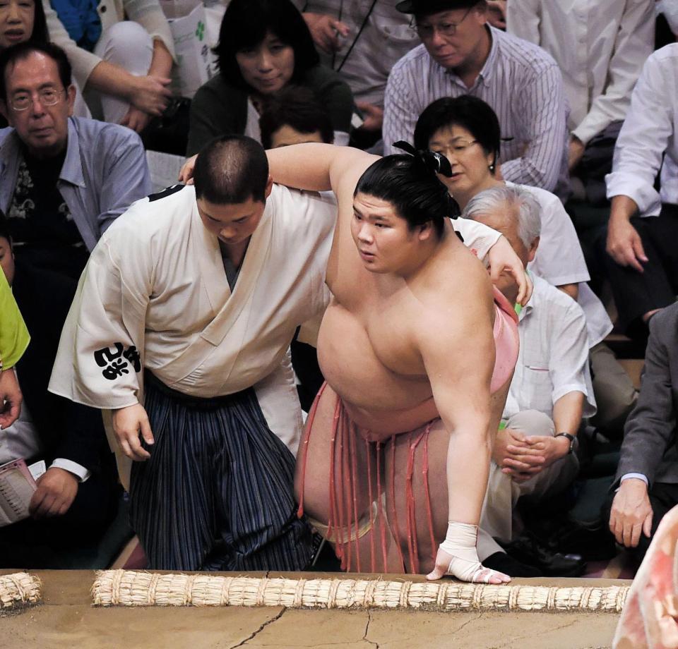 宇良が車いすで花道下がる 貴景勝に突き倒され、右膝を痛める