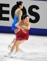 勝負のフリーに向け、坂本花織(奥)らと調整する本田真凜=武蔵野の森総合スポーツプラザ(撮影・高部洋祐)