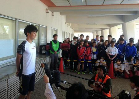 記録会に参加した中高生や多くの観客から「かっこいい!」などの声援を浴び、レース後の囲み取材の場には、約100人が詰めかけた。スタート前には「多田修平選手が走ります」というアナウンスもあり、序盤の加速に「おー」という歓声も上がった。「ビックリしています」と目を丸くした多田だが「応援は力になるので、走りにつなげられるように」と感謝した。