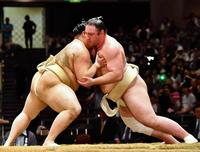 御嶽海(右)と稽古をする栃ノ心=両国国技館(撮影・中田匡峻)