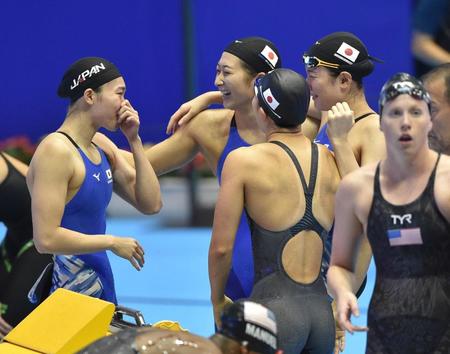 高校生の酒井は「自分のベストを出せば、頼もしい先輩3人がいるので絶対メダルが取れると思っていた」と笑顔。直前に個人種目で200メートルを泳いだばかりの青木は「最後本当にきつかったんですが、メダルへ死ぬ気で頑張りました」。今大会4個目のメダルを獲得した池江は「自分が順位を上げていかないとと思っていた。力は残っていないですけど、声援のおかげで力を出し切ることができました」と全12レースを泳ぎ切った。アンカー青木は「メダルと日本新を狙いました。応援してくれる人、待っている3人の顔を思い浮かべて死ぬ気で頑張りました」と納得のレースを振り返った。