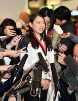 メダルを手に笑顔を見せる紀平梨花=成田空港