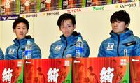 記者の質問に答える東海大・小松陽平=東京都千代田区の読売新聞東京本社前
