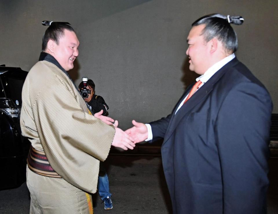 3連勝の白鵬、スーツ姿の荒磯親方と対面「似合っているね」と笑顔