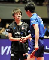 試合途中、右手の異常を訴え治療を受ける張本智和(右)=横浜文化体育館(撮影・開出牧)