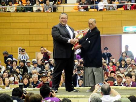 「稀勢の里ー」の大コールとともに「何で引退したんだ」、「背広姿、似合ってるぞ」と温かい声援が飛んだ。三次市長から花束を受け取り、現役生活をねぎらわれた。