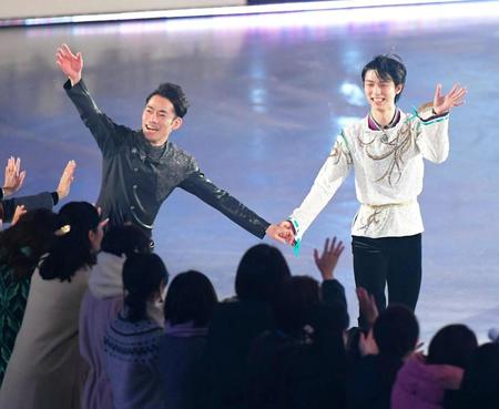 全スケーターが登場してのフィナーレ。1列になり、四方にあいさつをし終えると、羽生は高橋を呼び寄せ、列から引っ張り出した。2人は手を取り合い、おどけながら、場内を1周。サプライズ“共演”でファンに感謝を伝えた。