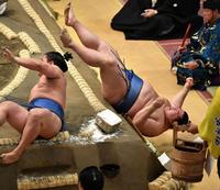 初日の取組で若隆景(手前)を突き落としで下す正代=8日