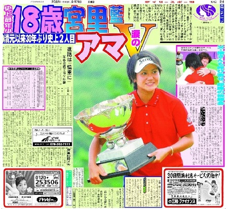 【2003年9月29日デイリースポーツ紙面より】 宮里藍(18)=東北高3年=が71で回り、通算5アンダーとし、女子プロトーナメント30年ぶり史上2人目のアマチュア優勝を達成した。しかも18歳102日での優勝は従来の記録を1歳以上も更新する史上最年少V。1打差の2位を片山真里、山口裕子が分けた。現在賞金ランキング1位の不動裕理は出場していない。今回の優勝で、宮里は4週間以内にプロ宣言にあたる“ツアーメンバー登録”をすれば、プロとして1年間ツアーに出場できる。進路は家族会議を経て決定する。