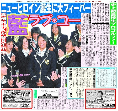 【2003年10月8日デイリースポーツ紙面より】 女子ゴルフの宮里藍(18)=宮城・東北高3年=が7日、仙台市内の東北高で記者会見し、正式にプロ転向を表明した。ミヤギテレビ杯でアマチュアとして30年ぶりのツアー優勝を果たしてから2週間後、晴れて日本初の高校生プロが誕生した。