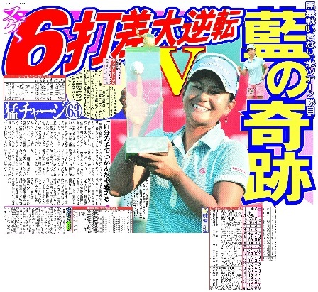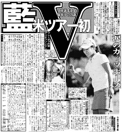 【2009年7月29日デイリースポーツ紙面より】 宮里藍(24)=サントリー=が、プレーオフを制し、米ツアー本格参戦4年目で悲願の初優勝を果たした。日本女子選手の同ツアー制覇は99年の福嶋晃子以来6人目で、24歳での優勝は日本選手史上最年少。首位に1打差の4位から出た藍は5バーディー、2ボギーの69で回り、通算14アンダーで並んだソフィー・グスタフソン(スウェーデン)とのプレーオフに突入。18番を使ったプレーオフ1ホール目でグスタフソンがパー、藍がバーディーとして勝利をつかんだ。