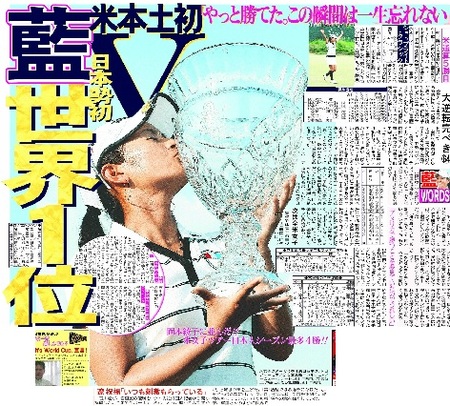 【2010年6月22日デイリースポーツ紙面より】 藍、逆転Vで日本勢初の世界ランク1位―。3位から出た宮里藍(25)=サントリー=が7バーディー、ノーボギーの64をマークし、通算16アンダーで今季4勝目を挙げた。米ツアー通算5勝目は、米国内での初勝利となった。米女子ツアーでの日本人のシーズン4勝は、1987年の岡本綾子に並ぶ最多勝記録。一夜明けて発表された最新の世界ランクで宮里藍は日本勢初の世界ランク1位に浮上した。