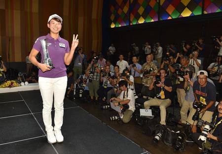 1977年に全米女子プロを制した樋口久子以来、42年ぶりの日本人海外メジャー制覇の快挙を達成。大勢の報道陣を前に優勝を報告し、「正直、緊張して何をしゃべっていいか…。本当にうれしく思います」と、満面の笑みを浮かべた。