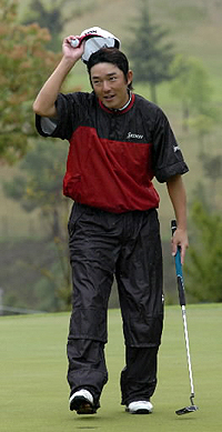 ツアーシード権を持つ実力者・宮本が雨に負けた?悪天候を想定していなかったため、クラブカバーを急きょ手作りした。「黒いゴミ袋に穴を開けて、ひもを通して…。朝からドタバタですよ。敗因はこれですね」と苦笑いだった。