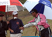 雨中のプレーと、優勝の興奮とで上気した顔をさらにクシャクシャにして、山下は最高の笑顔を見せた。01年奈良オープン、05年関西オープンに続くタイトルは、これまでにない特別な味わいだった。