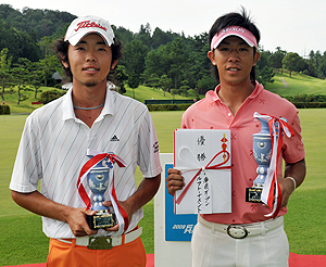 写真は表彰式で優勝カップを手に笑顔をみせる上井邦浩(右)とアマの部優勝の徳永智也