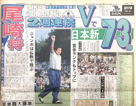 【1992年5月4日デイリースポーツ紙面より】ジャンボ、敵なしの2週連続Vで新記録73勝-3日、愛知県・名古屋GC和合コースで行われた中日クラウンズ最終日、首位でスタートの尾崎将司(45)は前半で3バーディーで独走態勢を固め、ノーボギーの堅実さもみせて通算10アンダーで優勝。今季2勝目、7回目の2週連続Vとなった。また、これで通算勝利は“73”(ツアー55勝)。前週で並んでいた樋口久子を抜き№1の座に就くと同時に、次週フジサンケイクラシック(静岡)で自身の持つ日本記録、3週連続Vへ挑む。