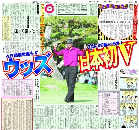 【デイリースポーツ2004年11月22日紙面より】 通算13アンダーの単独首位で出たタイガー・ウッズ(28)=米国=が5バーディー、2ボギーの67で回り、通算16アンダーで逃げ切った。ウッズは日本ツアー初制覇で、ストローク戦の優勝は昨年10月のWGCアメリカンエキスプレス選手権以来で、通算48勝目(米ツアー40勝)。川岸良兼が通算8アンダーで2位に入った。