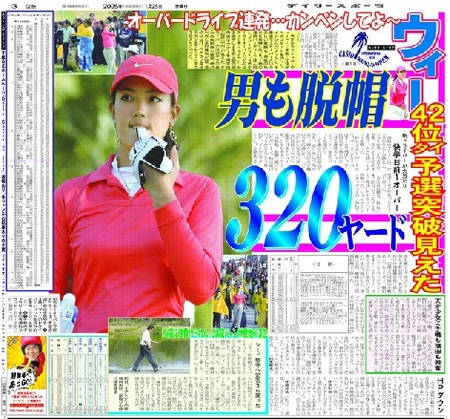 【2005年11月20日デイリースポーツ紙面より】天才少女ミシェル・ウィー(16)=米国=が快挙へのスタートを切った。インからスタートし、5番まで3オーバーという苦しい展開も、脅威の粘りを発揮した。6、7番の連続バーディーでばん回し、2バーディー、3ボギーの1オーバー73で42位タイでホールアウト。女子選手による史上初の国内男子ツアー予選突破(60位以内)が見えた。ドライバーでは男子プロ並みの飛距離も披露。伊沢利光と木村佳昭が68で首位に並び、ベテラン尾崎将司が首位から1打差の3位タイにつけた。