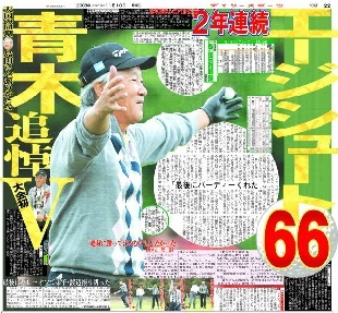 【2008年11月10日デイリースポーツ紙面より】<鬼ノ城シニアオープン・最終日> 首位タイでスタートした青木功(66)は7バーディー、1ボギーの66で回り、エージシュートを達成すると、通算14アンダーに並んだ渡辺司(51)との4ホールに及ぶプレーオフも制し、今大会初優勝を飾った。青木は自身が持つシニアツアーの最年長優勝記録も66歳2カ月に更新した。(中略)ゴルフへの情熱が尽きることはない66歳。最後はギャラリーに「こうやって青木功が66で元気でやってんだから、みんなも頑張ってよ!!」と締めくくった。