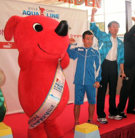 「ちばアクアラインマラソン」をPRした猫ひろし(左)と森田健作知事