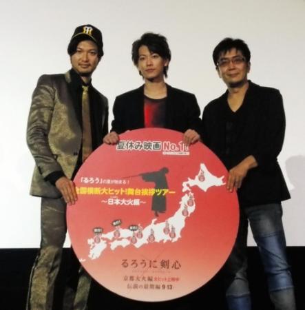 俳優・佐藤健(25)が9日、大阪市内で主演映画「るろうに剣心 京都大火編」の大ヒット御礼舞台あいさつを共演の青木崇高(34)、大友啓史監督(48)と行った。9、10日で全国10都市を回る。