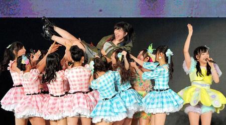 総選挙の前日会見で、V奪還の暁には胴上げを熱望していた指原。2年ぶりの頂点のお祝いに、後輩たちが一役買った。HKTが担当した中盤のMCコーナー、田島芽瑠(15)が「さしこちゃん、1位おめでとう。会見で言った言葉、覚えてる?」と切り出すと、博多娘の輪が広がった。