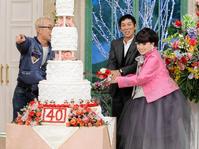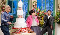 22日、テレビ収録でケーキカットのナイフを突き出し、芸人顔負けのボケをかます黒柳徹子(中央)。左はゲストの所ジョージ、右は明石家さんま=東京・テレビ朝日(撮影・開出牧)