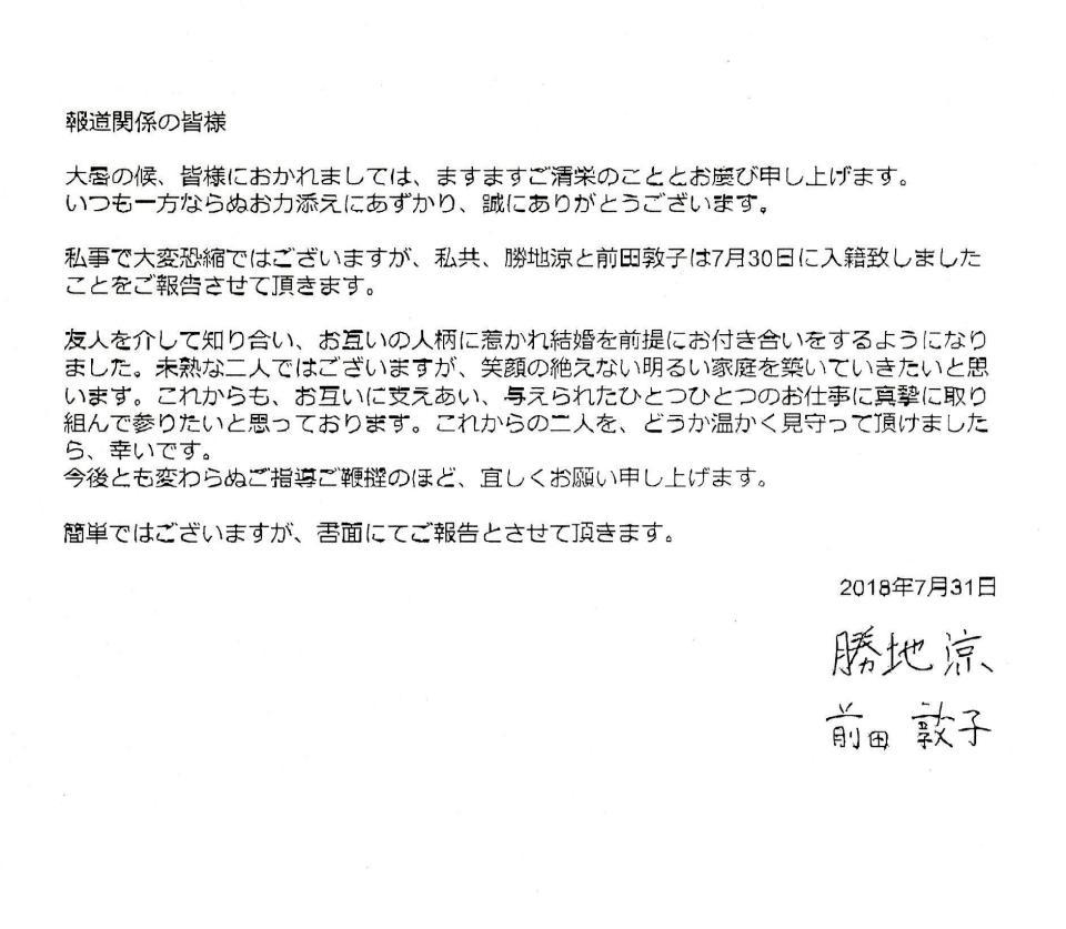 前田敦子と勝地涼が結婚【FAX全文】「笑顔の絶えない明るい家庭を」