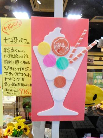 また、アイスがぎっしり詰まり、藤井七段の似顔絵入りチョコパイも入った「七段パフェ」(日付にちなみ、716円)も販売。「勝ったら、明日(17日)から『棋聖パフェ』として出します」と予告した。