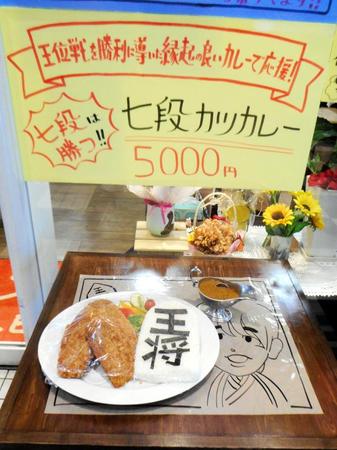 9日の棋聖戦第3局時に、同日限定で1枚100グラムのとんかつを7枚重ねた豪快な「七段カツ定食」(3900円)を考案した市内の喫茶「スマイル」はこの日、進化?させた「七段カツカレー」(5000円)をスタンバイ。