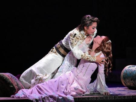 オスマン帝国の最盛期を築いた第10代皇帝スレイマンの生涯を描いた作品。ゴージャスな衣装にも負けることのない目力で、男役としての色気も漂う。