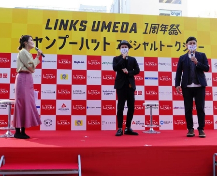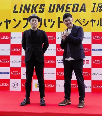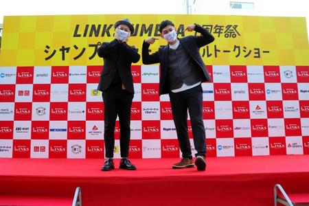 お笑いコンビシャンプーハットが14日、大阪市内で「LINKS UMEDA 1周年祭 シャンプーハットスペシャルトークショー」に登場。こいで(44)がデザインした「おもしろおもてなしマスク」を披露した。