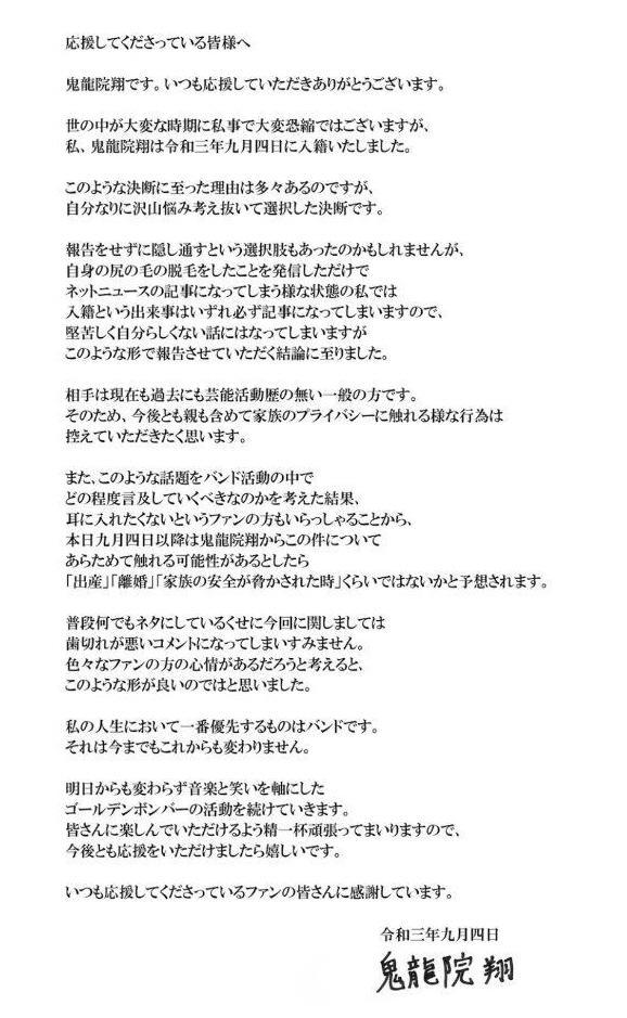 鬼龍院翔 一般女性と結婚【美麗直筆署名入り全文】「隠し通す選択肢もあるが」