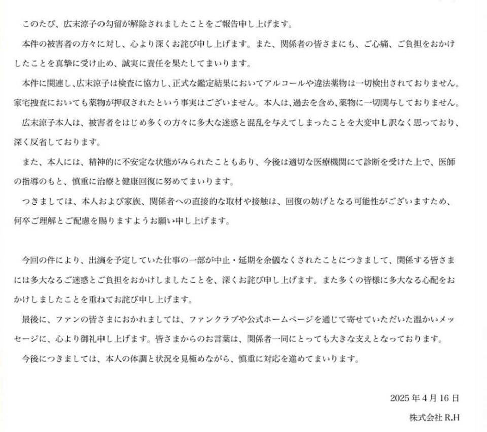 広末涼子 早朝釈放 病院直行か 事務所「医師の指導の下、慎重に治療と健康回復に努める」車内では笑みも