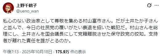 上野千鶴子氏のX投稿が波紋 村山富市元首相の死去直後に「戦犯」呼ばわり→「故人偲ぶ心ない?」「いかがなものか」