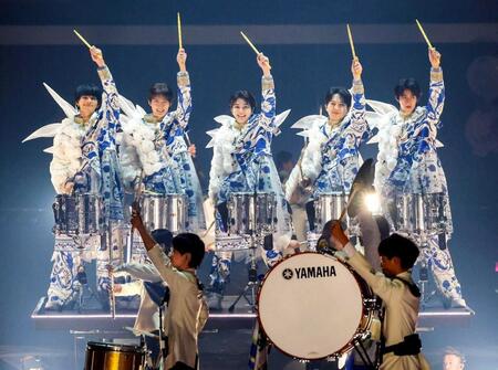 演出を担当した塩﨑太智(25)は「“はじける笑顔で帰ってもらう”をテーマに、M!LKと掛け合わせたら、何が面白いか」と思案。ステージ上に巨大すべり台や2人乗りブランコを現出させ、ブラスバンドとのコラボでは5人でスネアドラムに初挑戦した。