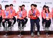 スラスラと筆を走らせたアンガールズの山根良顕(左)と見守る田中卓志